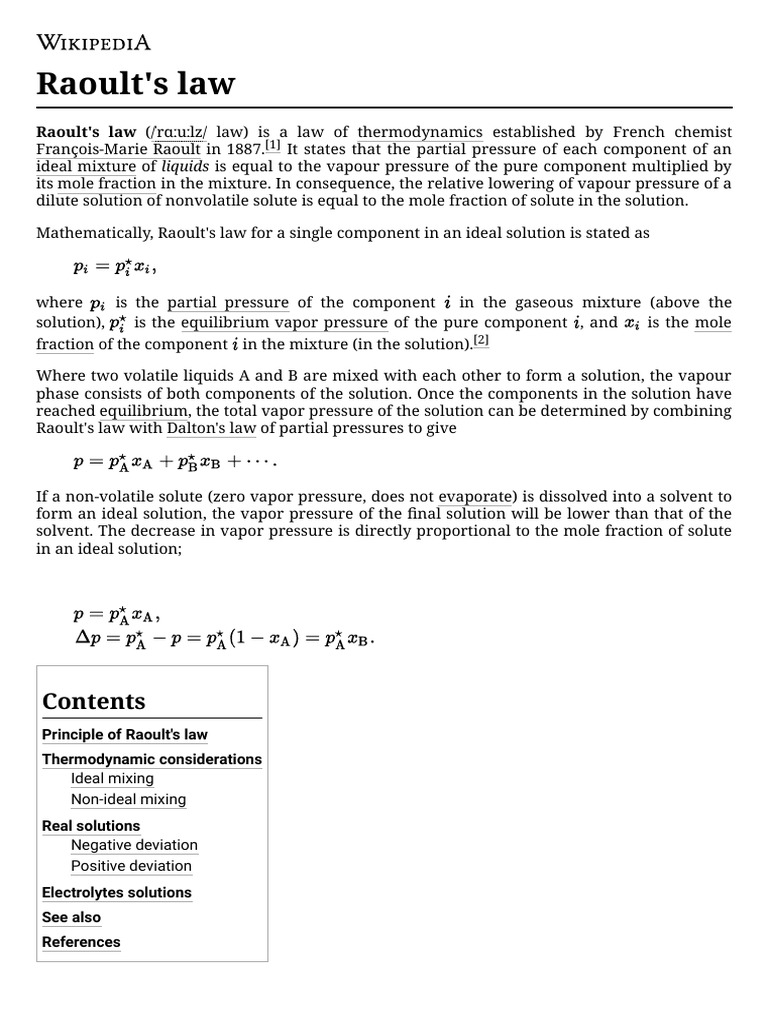These results illuminate the machinery underlying a long observed. Raoult's law states that the vapor pressure of a solvent above a solution is equal to the vapor pressure of the pure solvent at the same temperature scaled by the mole fraction of the solvent present.… Raoult's law states that a solvent's partial vapour pressure in a solution is equal or the same as the vapour pressure of the pure solvent multiplied by its mole fraction in the solution. Raoult — may indicate:* in physics, raoult s law on vapor liquid equilibrium. Raoult's law (räōōlz´) for f. Raoult's law (/ˈrɑːuːlz/ law) is a law of physical chemistry, with implications in thermodynamics. Positive deviation when the cohesive forces between like molecules are greater. Quantitatively, raoult's law states that the solvent's vapor pressure in solution is equal to its mole fraction times its vapor pressure as a pure liquid, from which it follows that the freezing point. This chemistry video tutorial provides a basic introduction into raoult's law which says that the vapor pressure of a solution is the product of the mole. Phenomenon and allow the accurate prediction of humid atmospheres for specific sample. …statement of this condition is raoult's law, which …and nonpolar components, deviations from raoult's law diminish as temperature rises. Raoult, a french physicist and chemist states that the addition of solute to a liquid lessens the tendency for the liquid to become a solid or a gas, i.e. ** françois marie raoult, after whom raoult s law is named;
